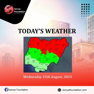 At Isonye Foundation, we believe that timely information helps save lives, especially for vulnerable groups such as persons with disabilities, women, and children. Please take note of today’s weather outlook across Nigeria: